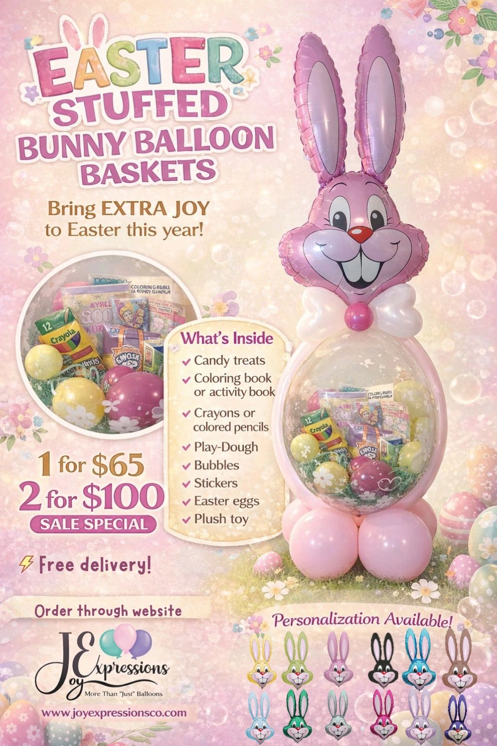Celebrate Easter in a fun and unforgettable way with our signature Stuffed Bunny Balloon Baskets. Each design features an adorable bunny topper and a beautifully styled clear balloon filled with candy, activities, and a plush surprise.